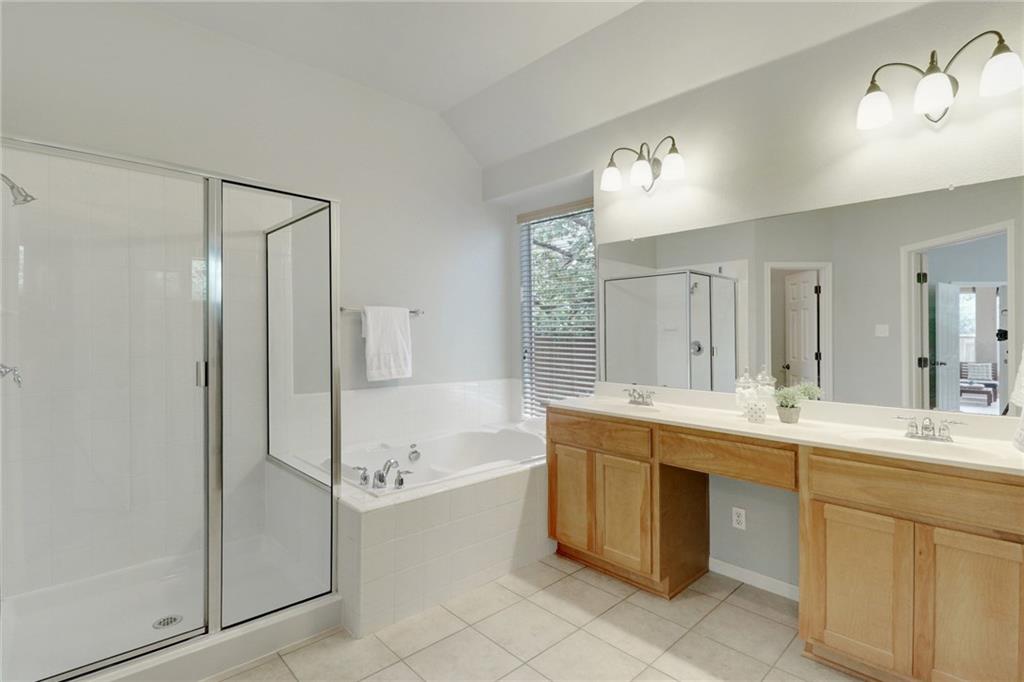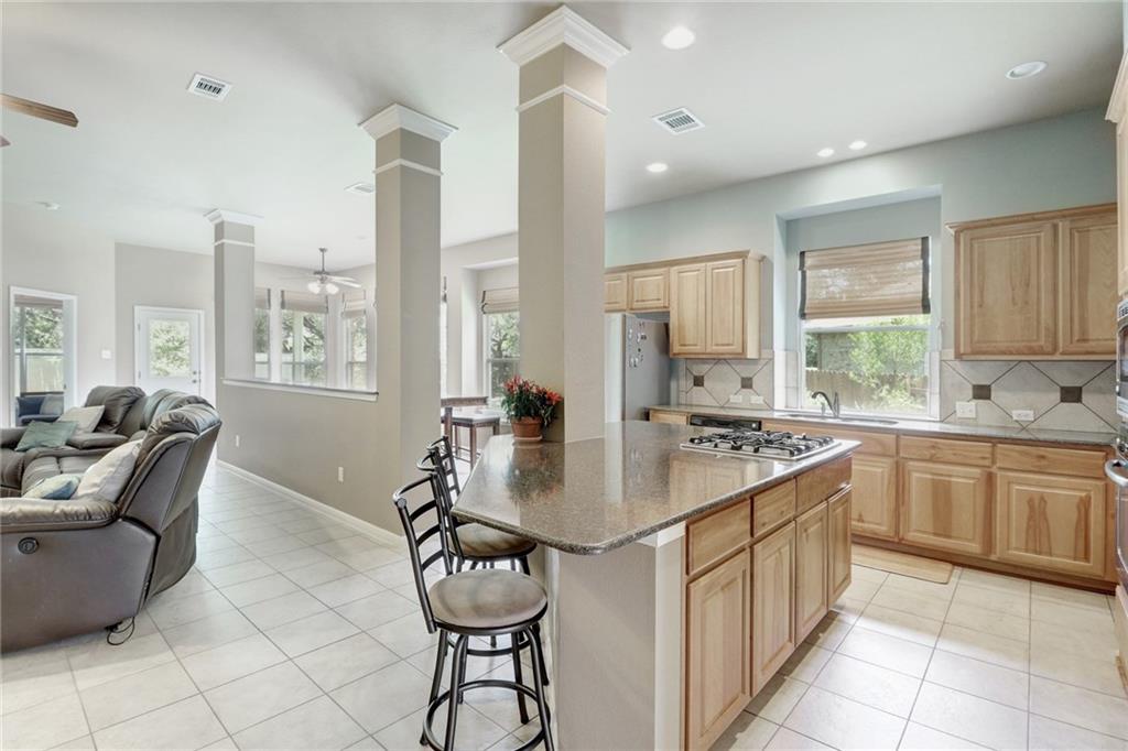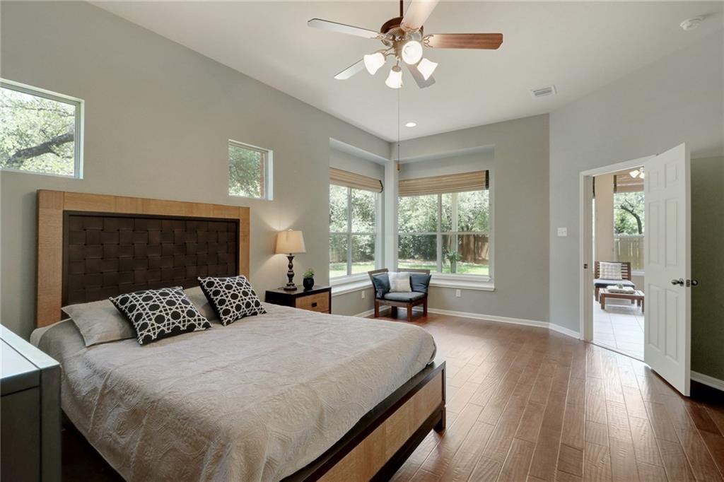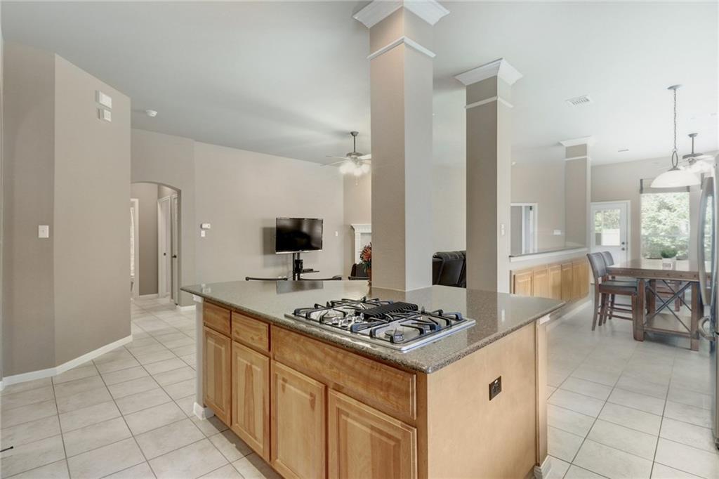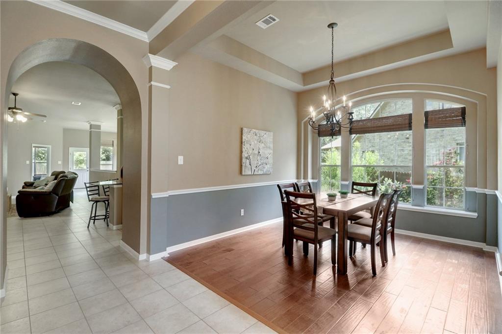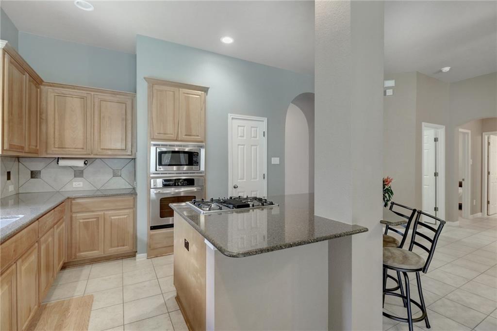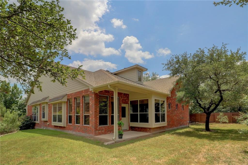 Gorgeous one story with hardwoods & tile with flat yard backing to greenbelt and on cul-de-sac. High ceilings, granite, stainless steel appliances, kitchen island & formal dining. Lots of eating areas for big families. Master suite faces backyard with two walk-in closets. Enjoy nearby pool, park, tennis courts & exemplary schools!