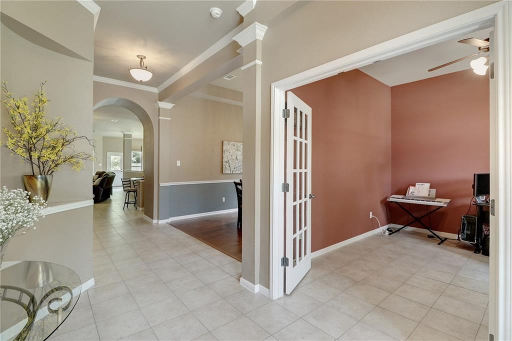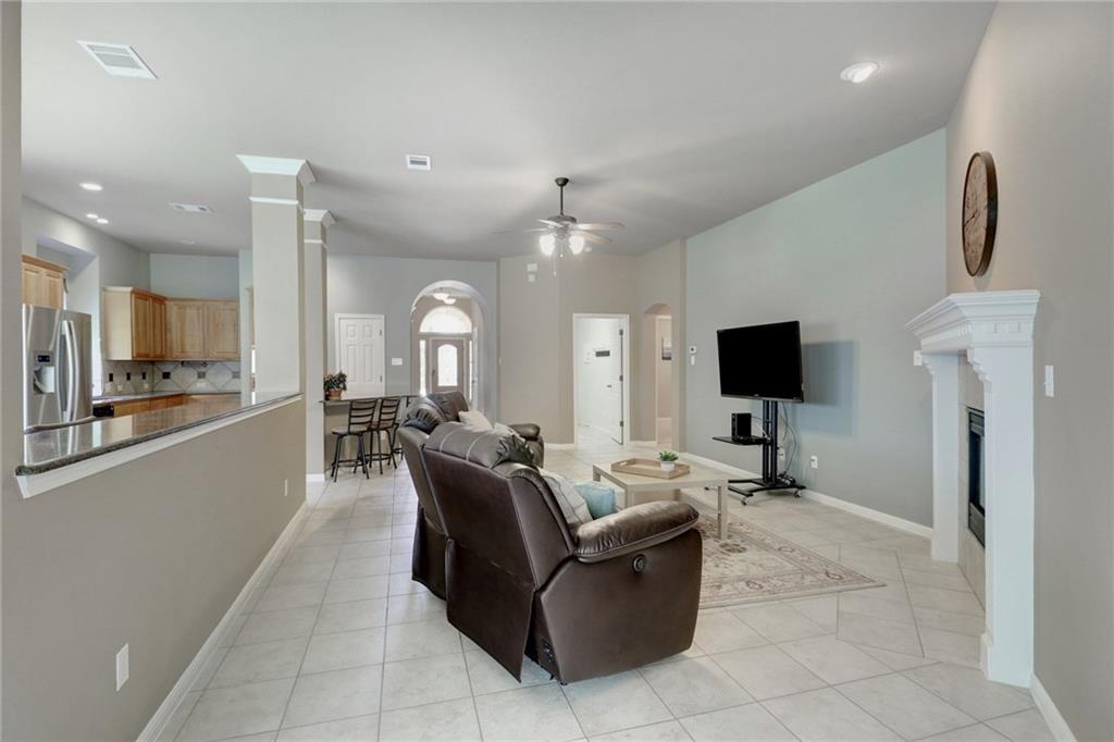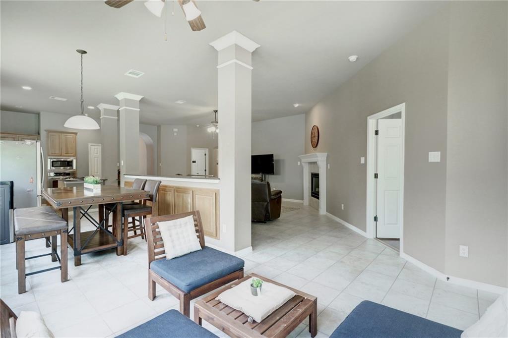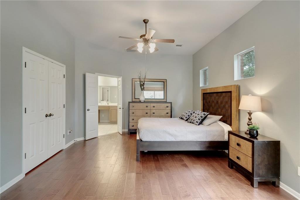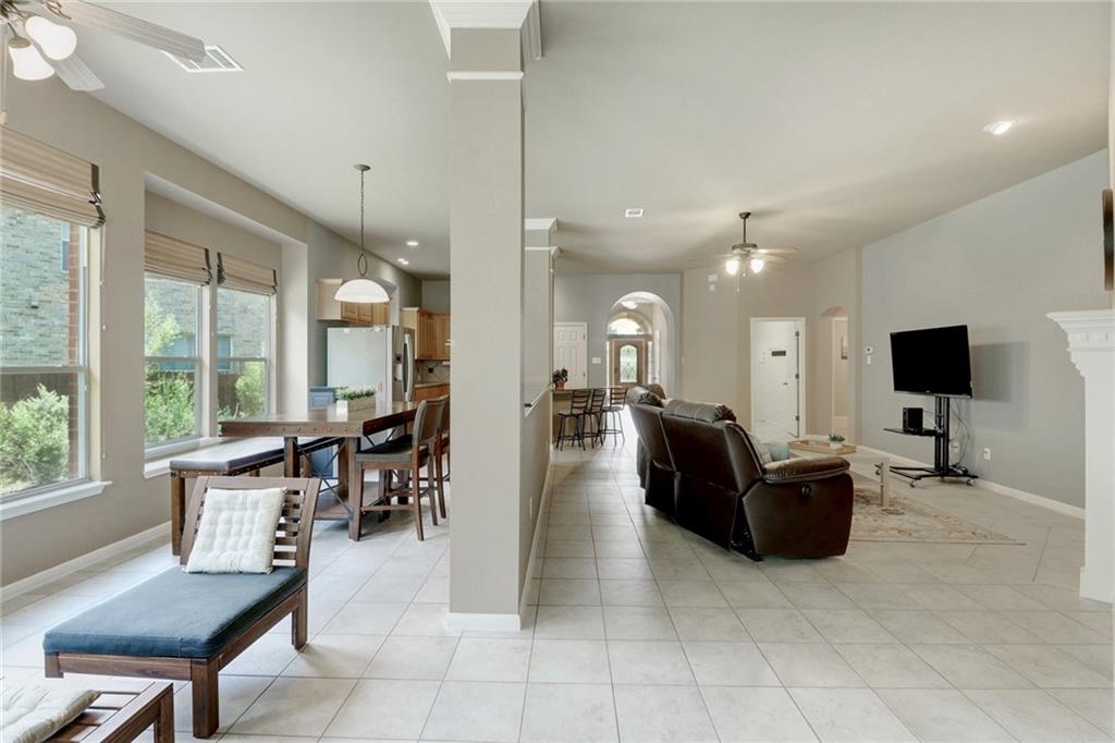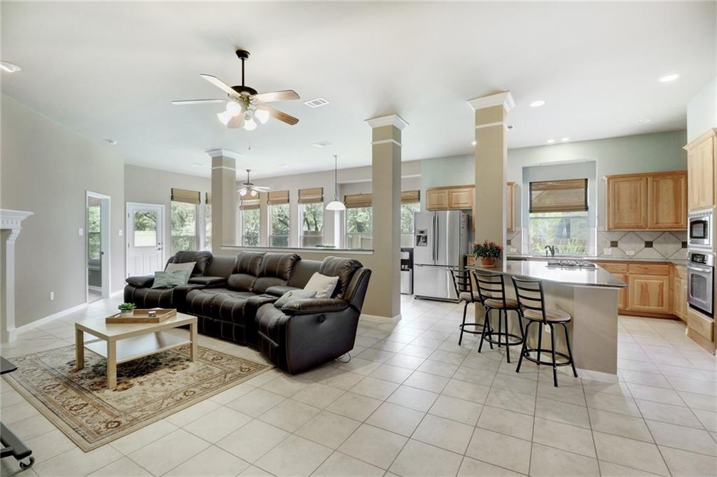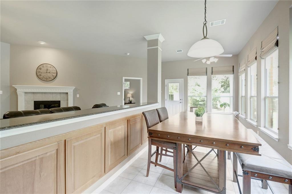 Gorgeous one story with hardwoods & tile with flat yard backing to greenbelt and on cul-de-sac. High ceilings, granite, stainless steel appliances, kitchen island & formal dining. Lots of eating areas for big families. Master suite faces backyard with two walk-in closets. Enjoy nearby pool, park, tennis courts & exemplary schools!